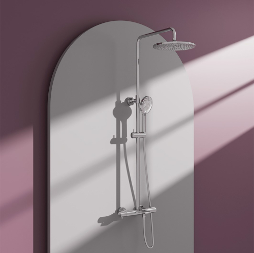 душевая стойка; комплект эксцентриков; термостат; верхний душ; душевой шланг; ручной душ; инструкция.